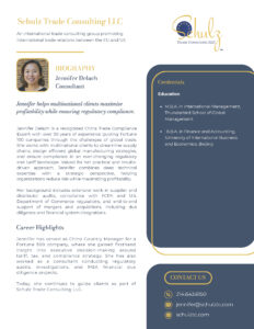 Jennifer has served as China Country Manager for a Fortune 500 company, where she gained firsthand insight into executive decision-making around tariff, tax, and compliance strategy. She has also worked as a consultant conducting regulatory audits, investigations, and M&A financial due diligence projects. Today, she continues to guide clients as part of Schulz Trade Consulting LLC.